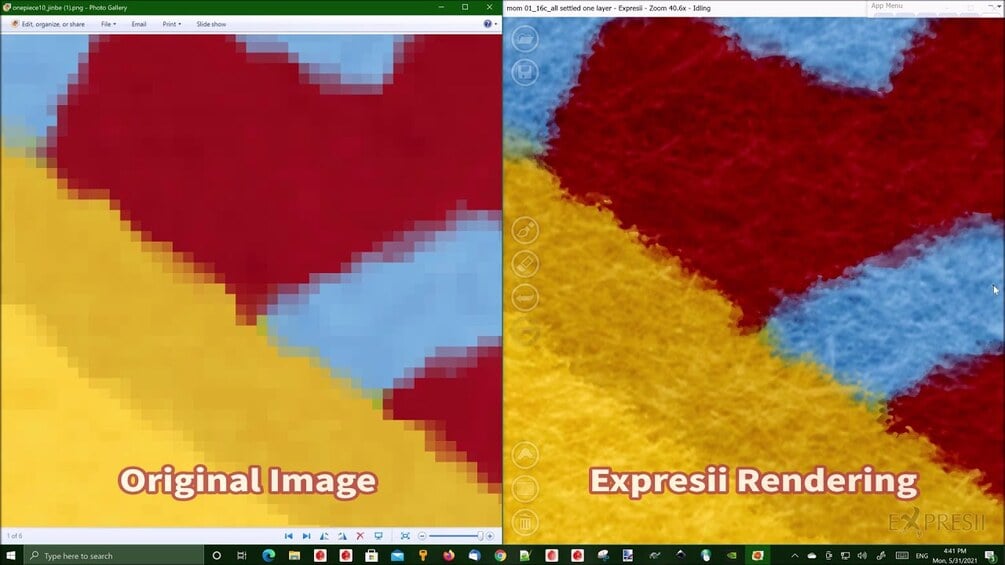 Finally, the simulation is paired with a new rendering method that gives you both raster richness and vector-like output up to 32k resolution. You can export your artwork with alpha channel to your favorite image editor for further processing. Our novel vexel rendering can enlarge an imported RGB image up to 40x and make it look as if done on paper so Expresii also doubles as an image enlarger for your existing illustrations.